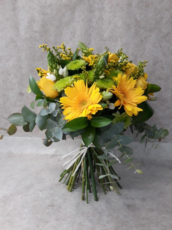 Bouquet composto por gerberas, margaridas, e verduras variadas Qualquer flor indisponível, será substituída por outra similar ou de valor idêntico.