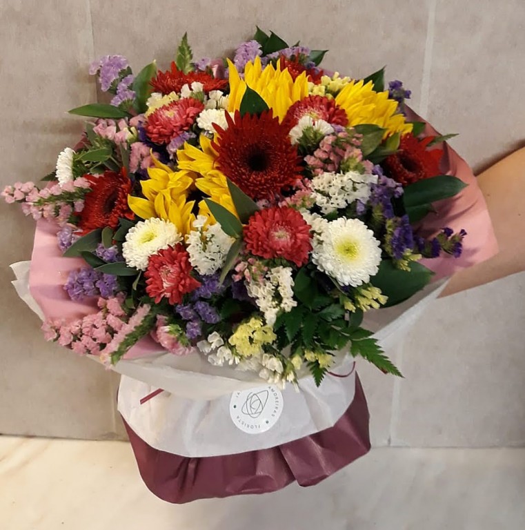 Bouquet composto por gerberas, girassois, statice, sécias. Qualquer flor indisponível, será substituída por outra similar ou de valor idêntico.