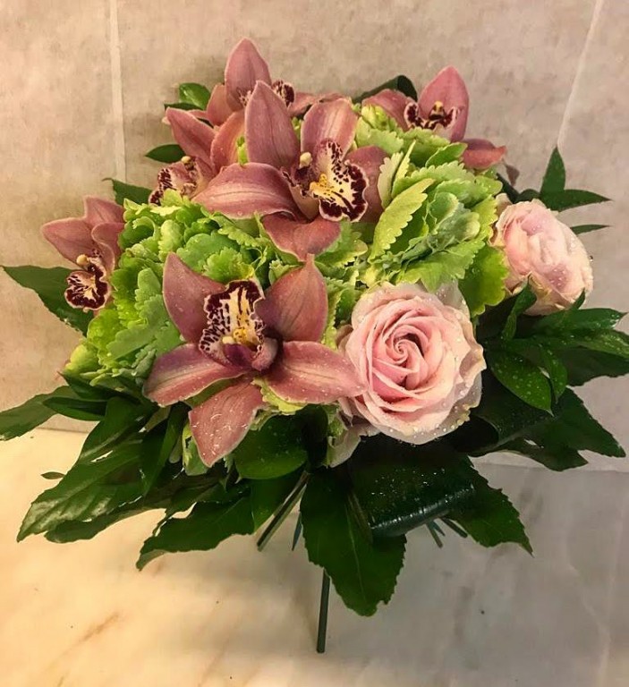 Bouquet composto por rosas, orquideas, hortenses, folhas variadas. Qualquer flor indisponivel, será substituída por outra similar ou de valor identico.