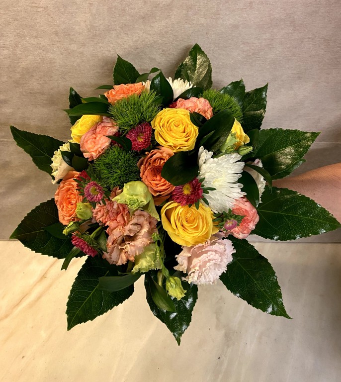 Bouquet composto por rosas, cravos, lisianthus, green trick, anastacias, folhas de aralias. Qualquer flor indisponivel, será substituída por outra similar ou de valor idêntico. Jarra não incluida.