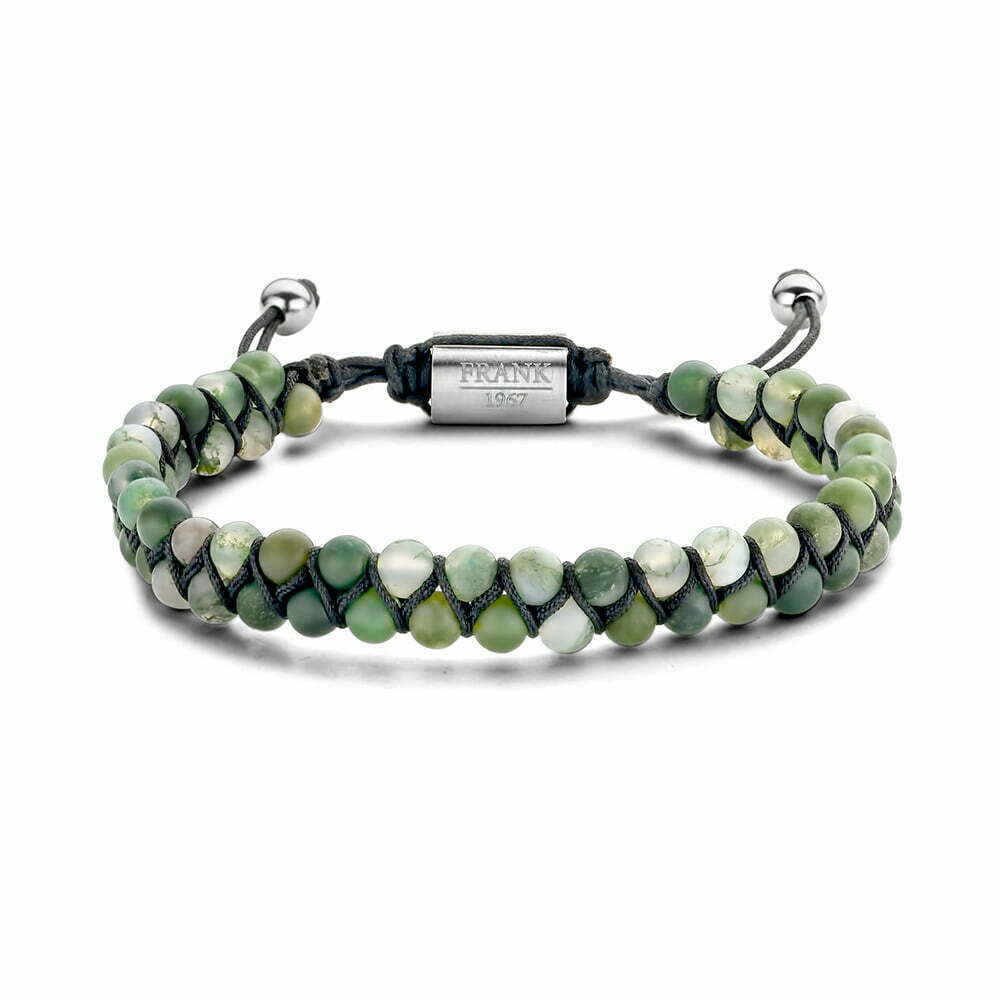 Uma pulseira elástica de 20 cm de contas de ágata verde brilhante e um fecho de aço inoxidável. Esta interessante peça pode ser usada sozinha ou combinada com outras peças da coleção.