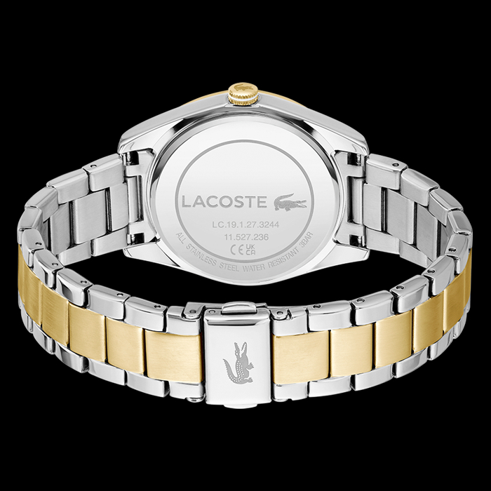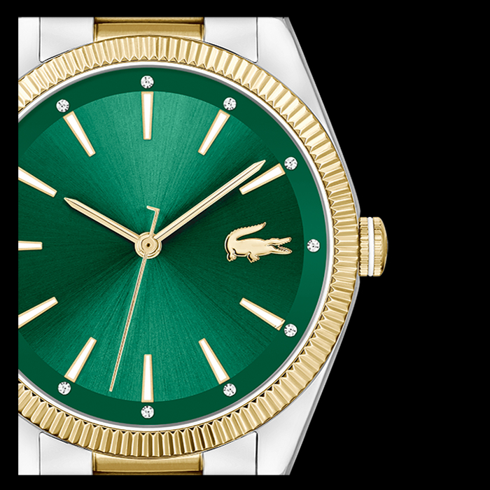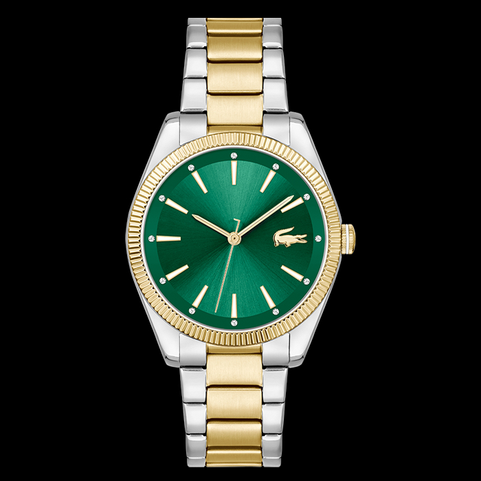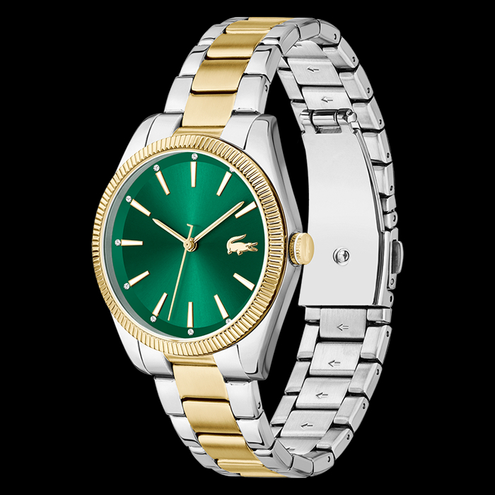 Relógio LACOSTE para mulher, com um design elegante, com um toque desportivo. Com uma caixa bicolor, e mostrador verde, com pormenores de cristais e ponteiros dourados, e bracelete de 3 elos bicolor.
