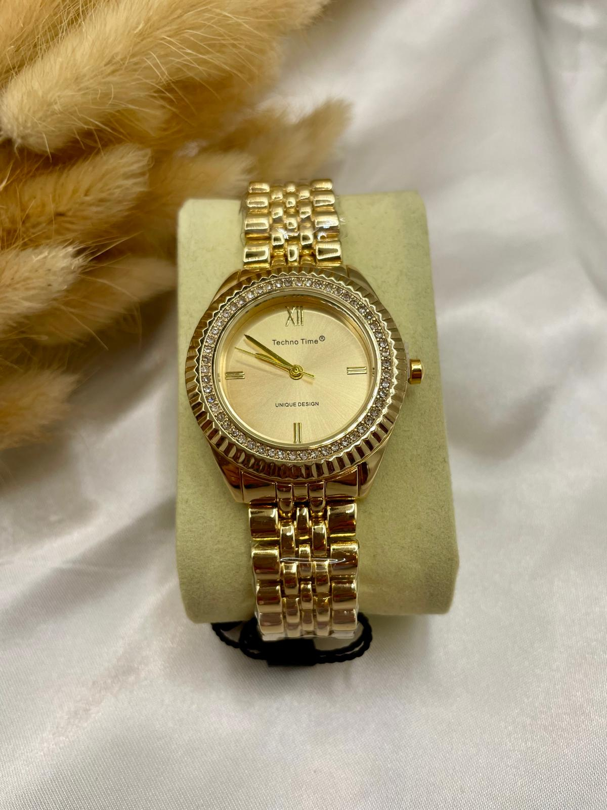 Relógio de senhora em aço inoxidavel com banho de ouro , visor de 3,4 cm com fundo dourado e com aro de microzirconias cravejadas. Bracelete com a possibilidade de retirar peças para afinação no pulso. Torna um look classico e elegante