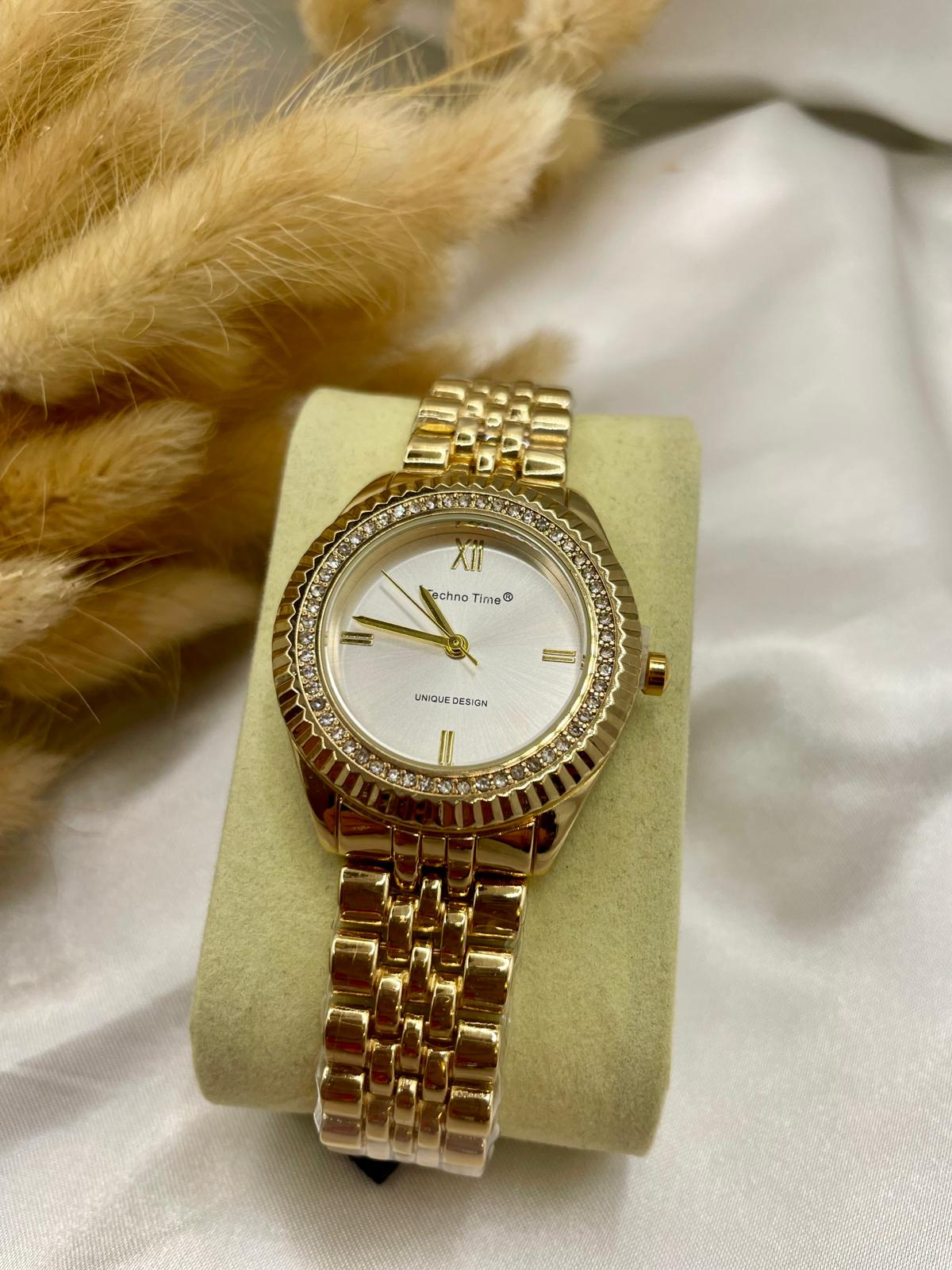 Relógio de senhora em aço inoxidavel com banho de ouro , visor de 3,4 cm com fundo prateado e com aro de microzirconias cravejadas. Bracelete com a possibilidade de retirar peças para afinação no pulso. Torna um look classico e elegante