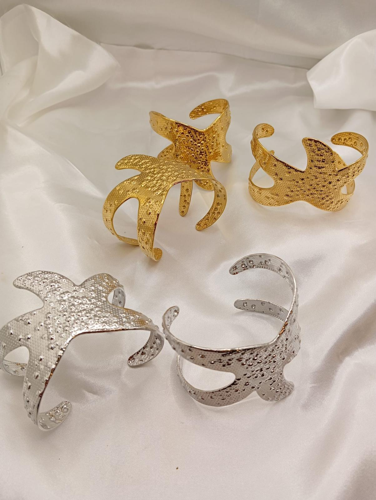 Pulseira escrava estela em aço inoxidavel ajustavel com 5.5 cm de diametro. Disponivel em dourado e em prateado.