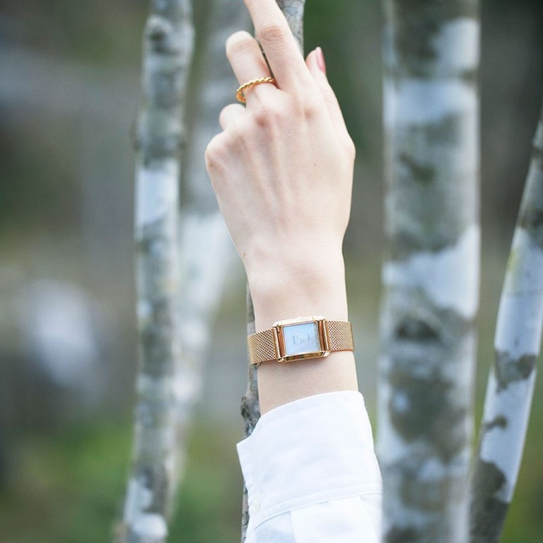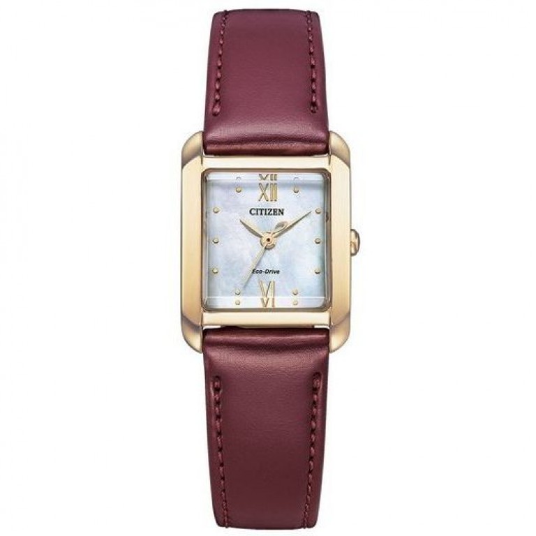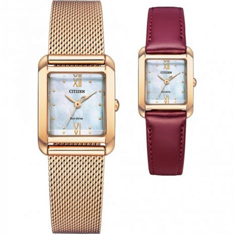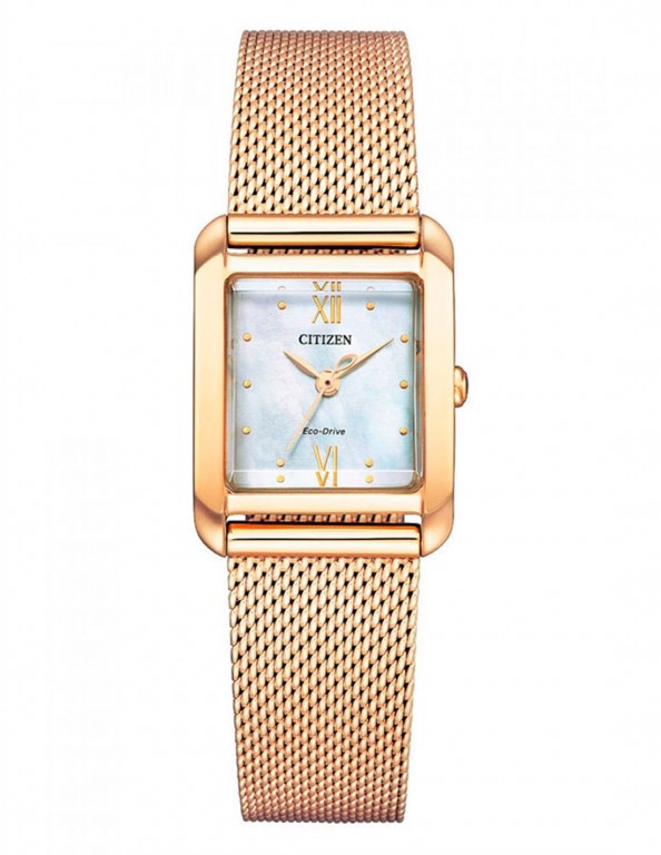 Relógio Citizen EW5593-64D, funcionamento eco-drive com reserva de carga aproximadamente de 6 meses. Caixa de aço inoxidável 21.5 mm. de diâmetro. Bracelete de aço mesh dourada + correia Ecopet Burdeos intercambiáveis. Vidro de Safira curvo. Fundo madrepérola. WR 5 bar.