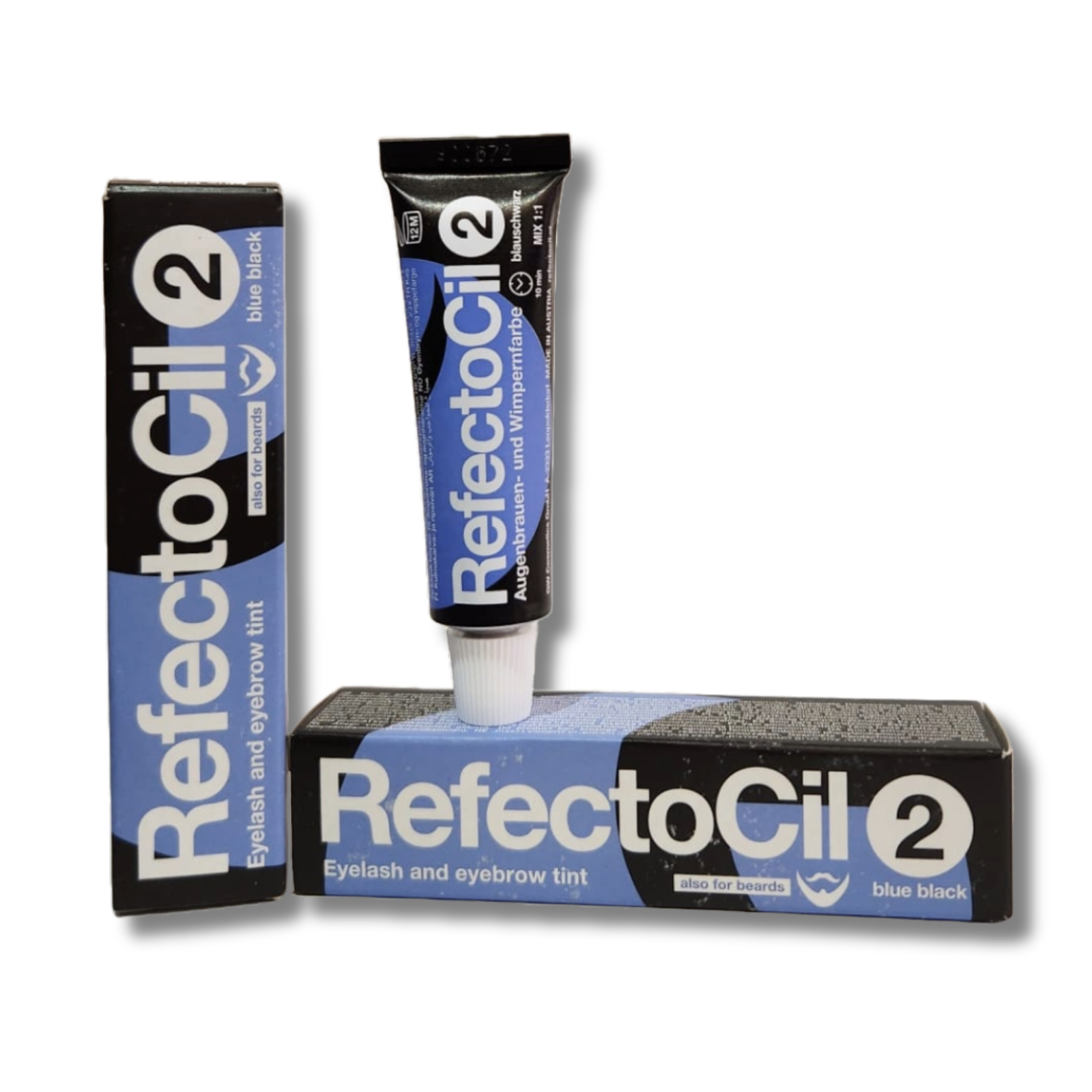 A tinta RefectoCil No. 2 Preto Azulado apresenta-se num tom de preto com um brilho azul.