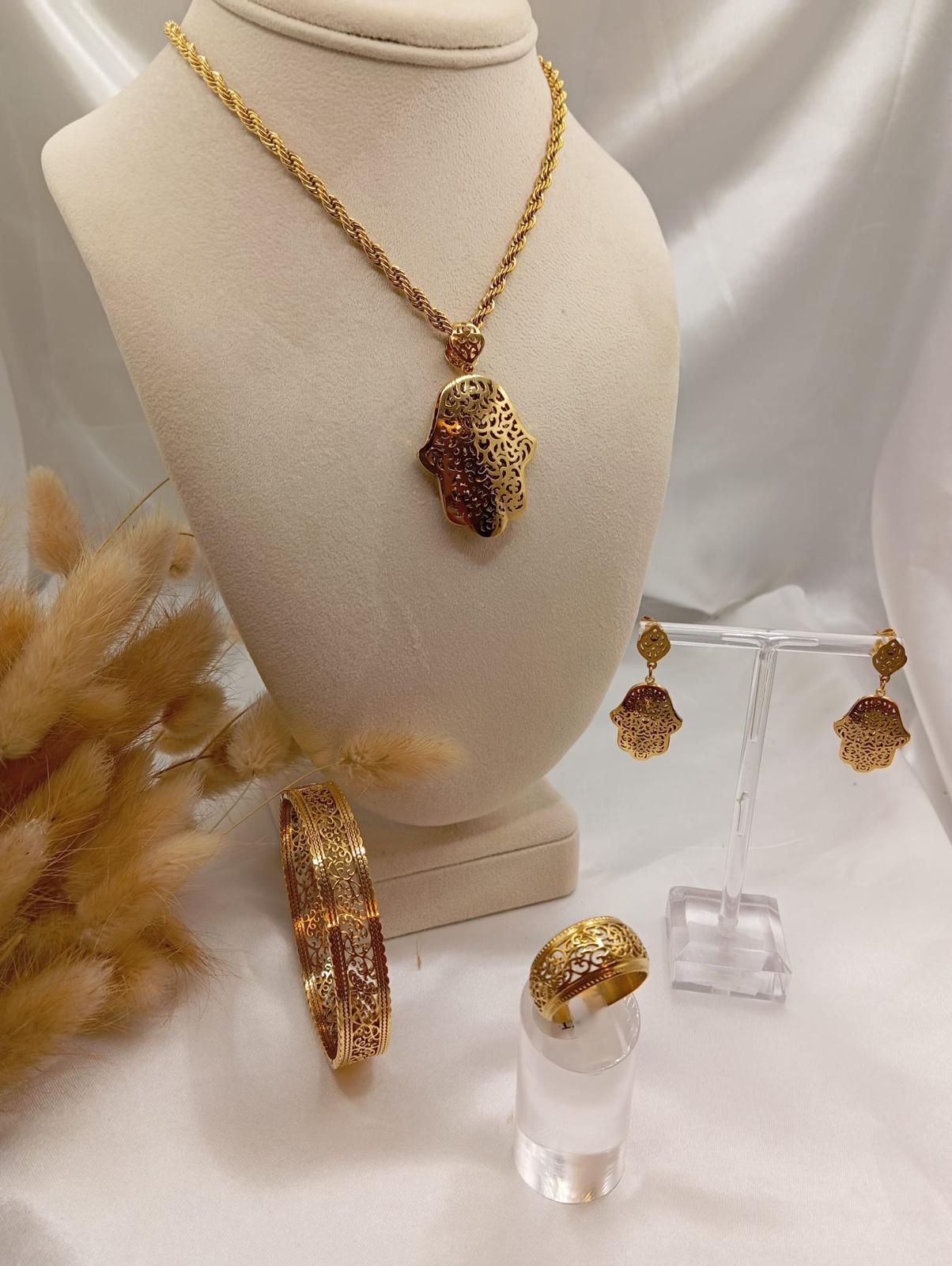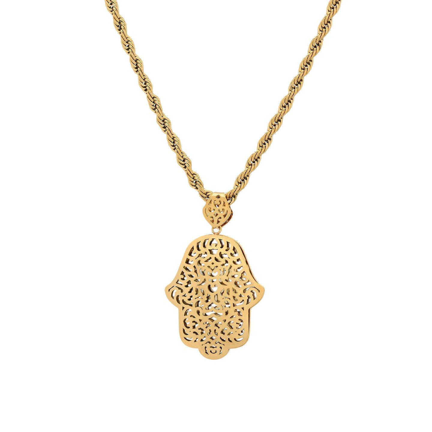 Colar Mão de Fátima, também conhecida como Hamsá, é um amuleto tradicional usado para proteção contra o mau-olhado e energias negativas.É um símbolo com origens no judaísmo e no islamismo, onde a mão aberta representa a proteção, a sorte, a força e atrai boas vibrações.No judaísmo, é chamada de Mão de Miriam, em homenagem à irmã de Moisés, e é associada aos cinco livros da Torá.No islamismo, é associada a Fátima, a filha do profeta Maomé, e aos cinco pilares do Islão (fé, oração, caridade, peregrinação e jejum). Colar de malha corda com pendente em formato de mão.