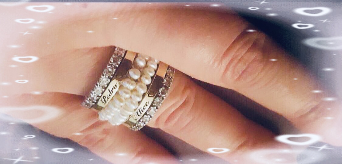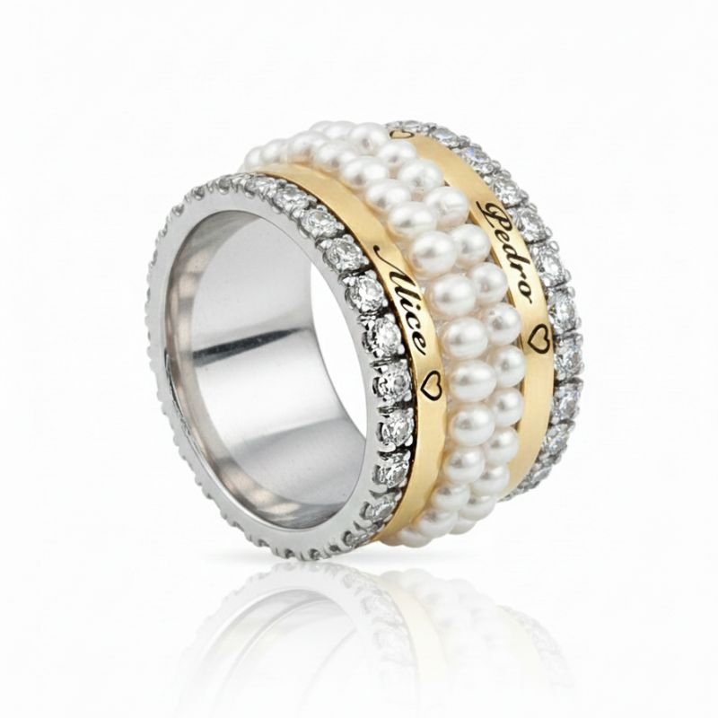 Aliança em ouro e prata com pérolas e zircónias personalizada. Faço qualquer tipo de gravações. JÓIAS COM GARANTIA VITALICIA