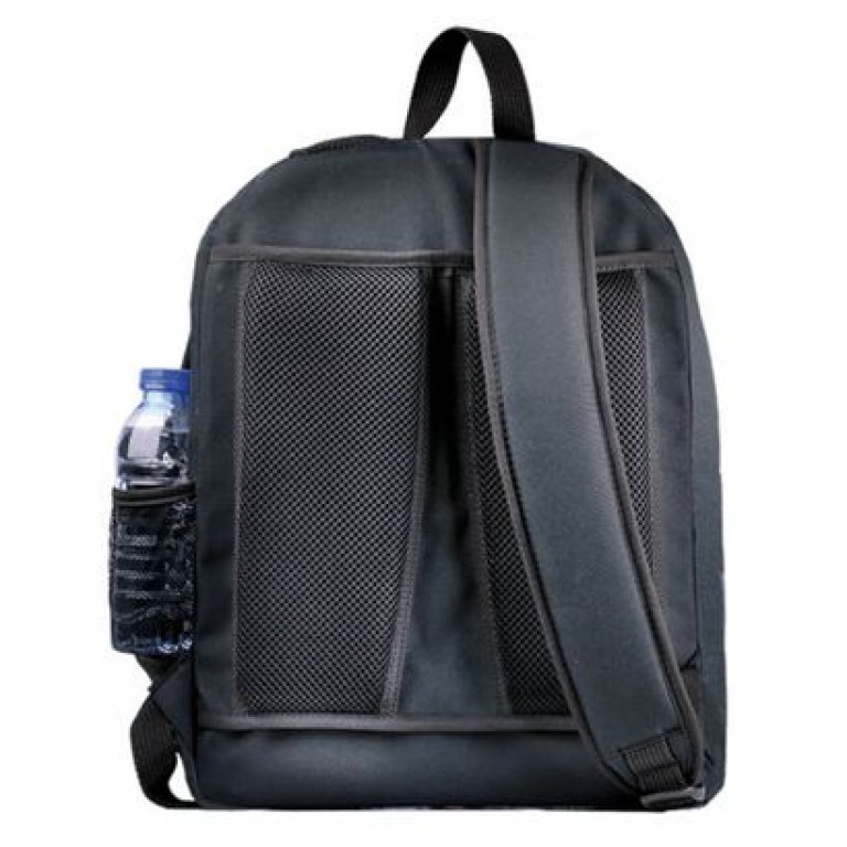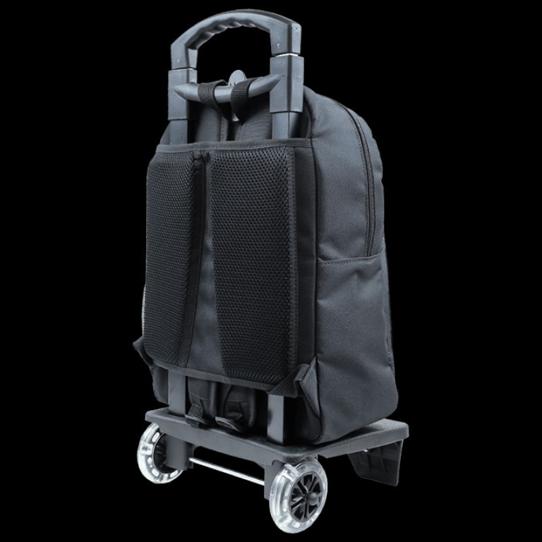 Bolsa em rede lateral. Mochila preparada para trolley (adquirido à parte).
