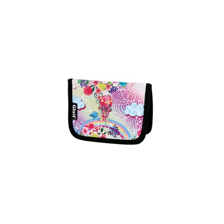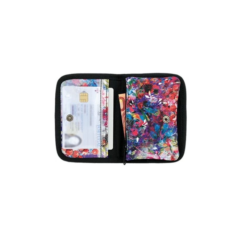 Carteirinha com mola, compartimentos para cartões, passe escolar, notas e porta-moedas com fecho no interior.
