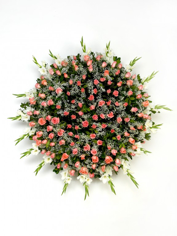 Coroa composta por rosas e gladiolos.