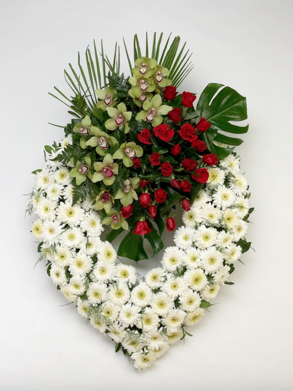 Coração composto por gerberas, rosas, orquideas. Disponivel noutras cores.
