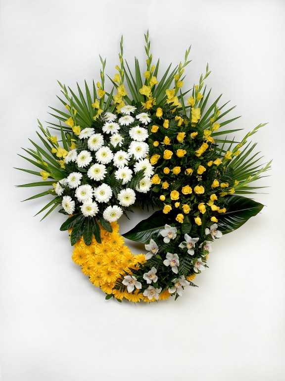 Coroa de gladiolos, rosas, gerberas, e orquideas.