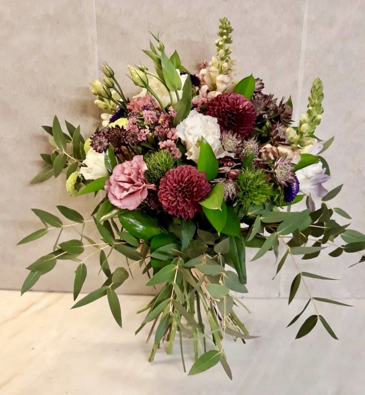Bouquet composto por lisianthus, limonium, eucalipto, antirrhinum, ping pong. Disponivel noutras cores. Qualquer flor indisponível, será substituída por outra similar ou de valor idêntico.