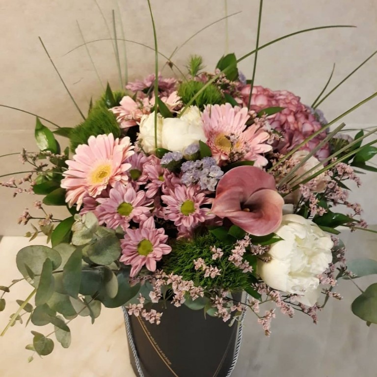 Caixa composta por rosas, gerberas, green trick, verduras, limonium. Qualquer flor indisponível, será substituída por outra similar ou de valor idêntico.