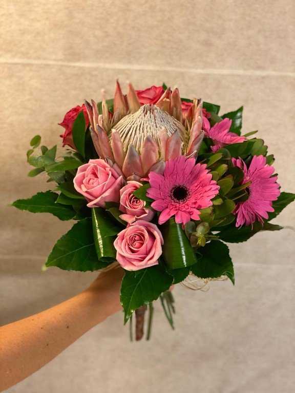Bouquet composto por rosas. gerberas, proteas, verduras