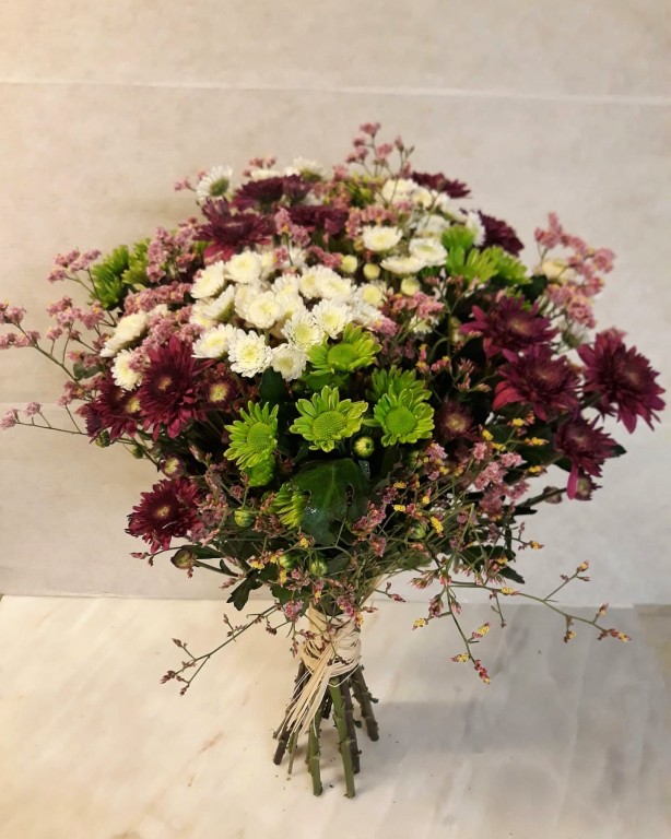 Bouquet composto por margaridas , limonium. Qualquer flor indisponível, será substituída por outra similar ou de valor idêntico.