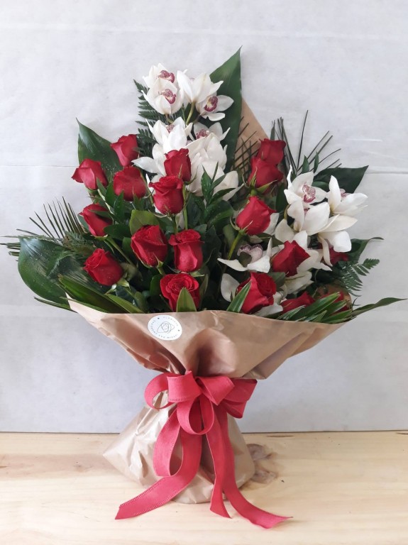 Ramo composto por rosas encarnadas e orquideas. Disponivel noutras cores.