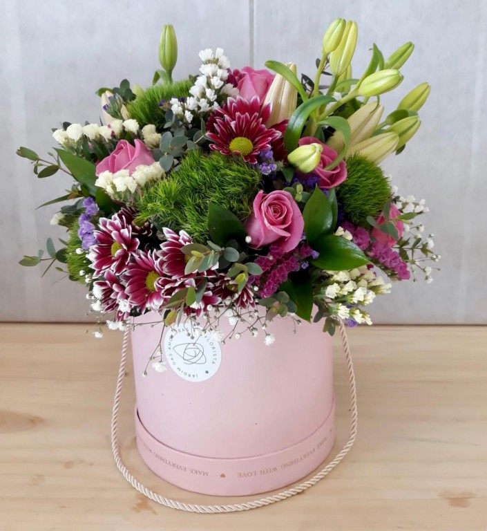 Caixa composta por margaridas, rosas, coroa imperiais, green trick, statice. Qualquer flor indisponível, será substituída por outra similar ou de valor idêntico.