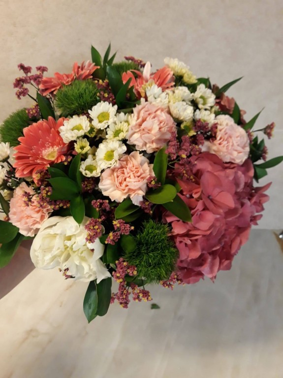 Bouquet misto composto por margaridas, cravos, gerberas, green trick, hortenses, verduras variadas. Qualquer flor indisponivel, será substituída por outra similar ou de valor idêntico.