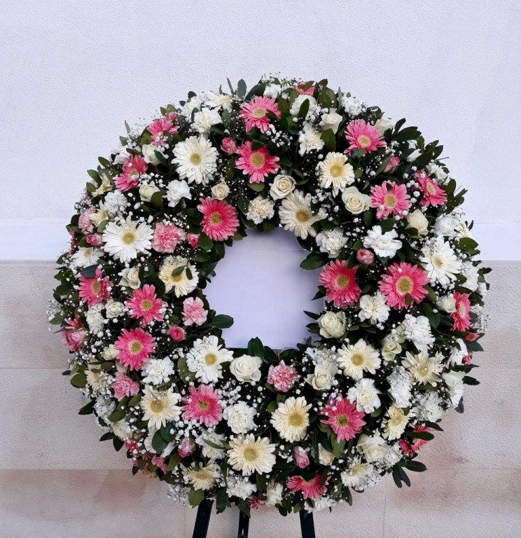 Coroa de rosas, cravos, gerberas. Disponivel noutras cores.