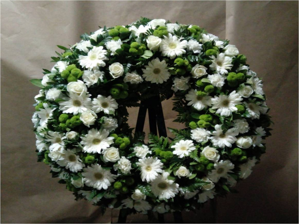Coroa de flores brancas variadas.
