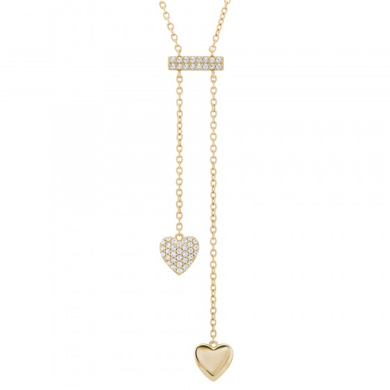 Este é um colar da Edição Especial Dia da Mãe para celebrar e agradecer todo o seu amor. Em Prata de Lei 925 com banho de Ouro e dois corações. Um dos elementos apresenta um acabamento liso tendo o outro o brilho da cravação de zircónias brancas. O seu design elegante adapta-se a qualquer ocasição. Uma joia que representa, de forma simbólica, o vínculo entre mães e filhos, com uma caixa especial que a vai elevar como presente.