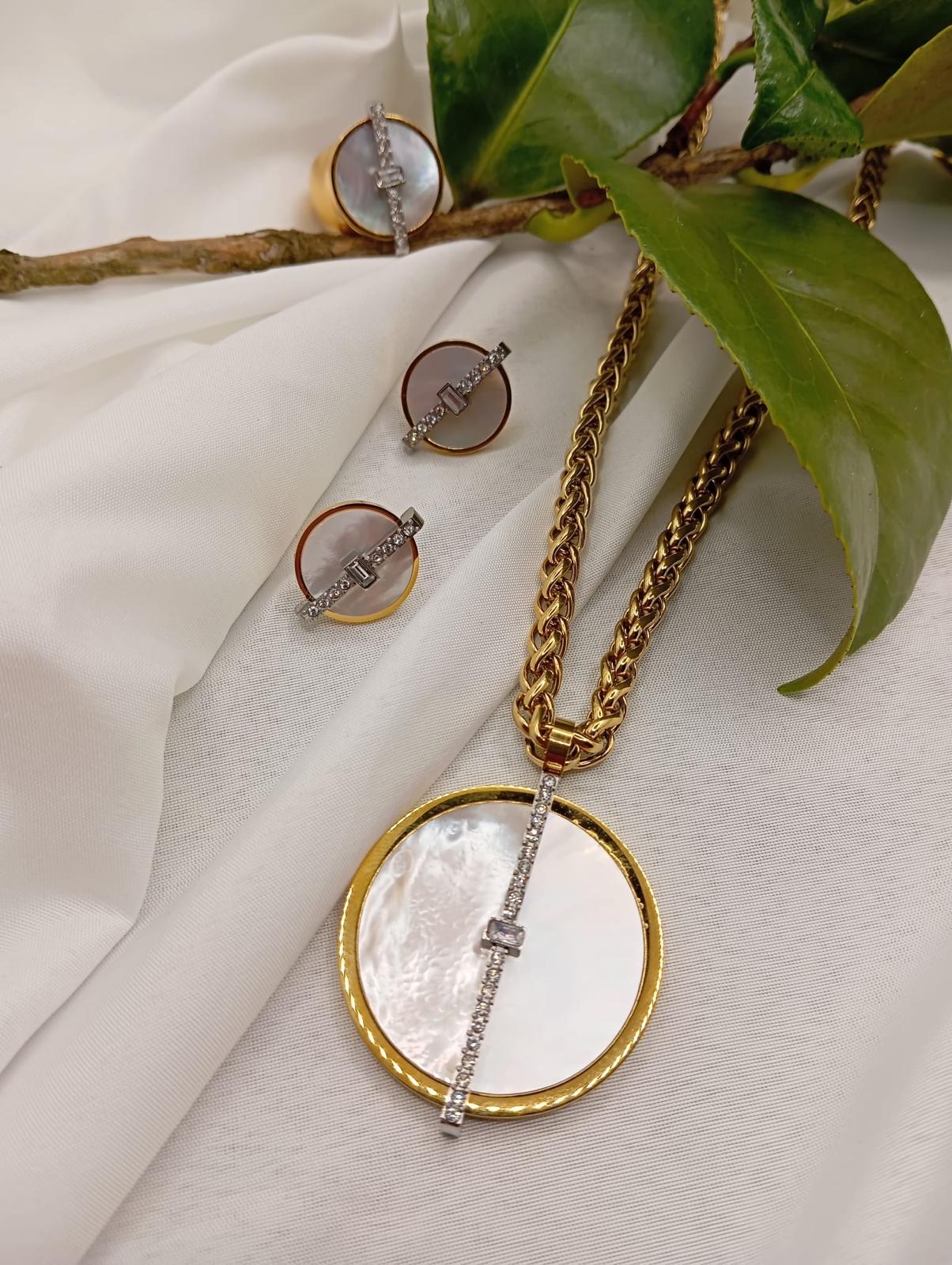 Colar inspiração , com medalhão redondo com pedra natural madreperola linha de microzirconias transparentes em aço inoxidavel com banho de ouro , colar de 45cm com extensor de 7cm e pendente de 4cm de diametro