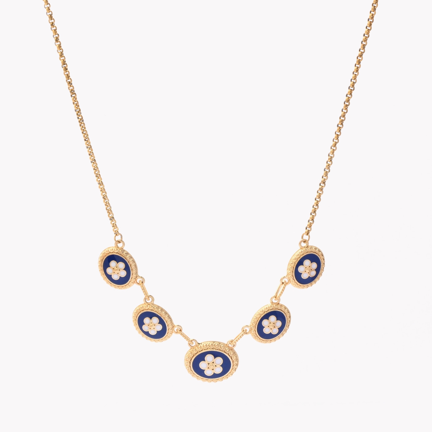 Colar 5 caramujos flor azul oval, em aço inoxidavel com banho de ouro 19K, inspirado nas joias tradicionais de filigrana portuguesa, colar de 42cm com extensor de 5cm e 4 pendentes de 1cm de diamero e 1 pendente de 1,5cm