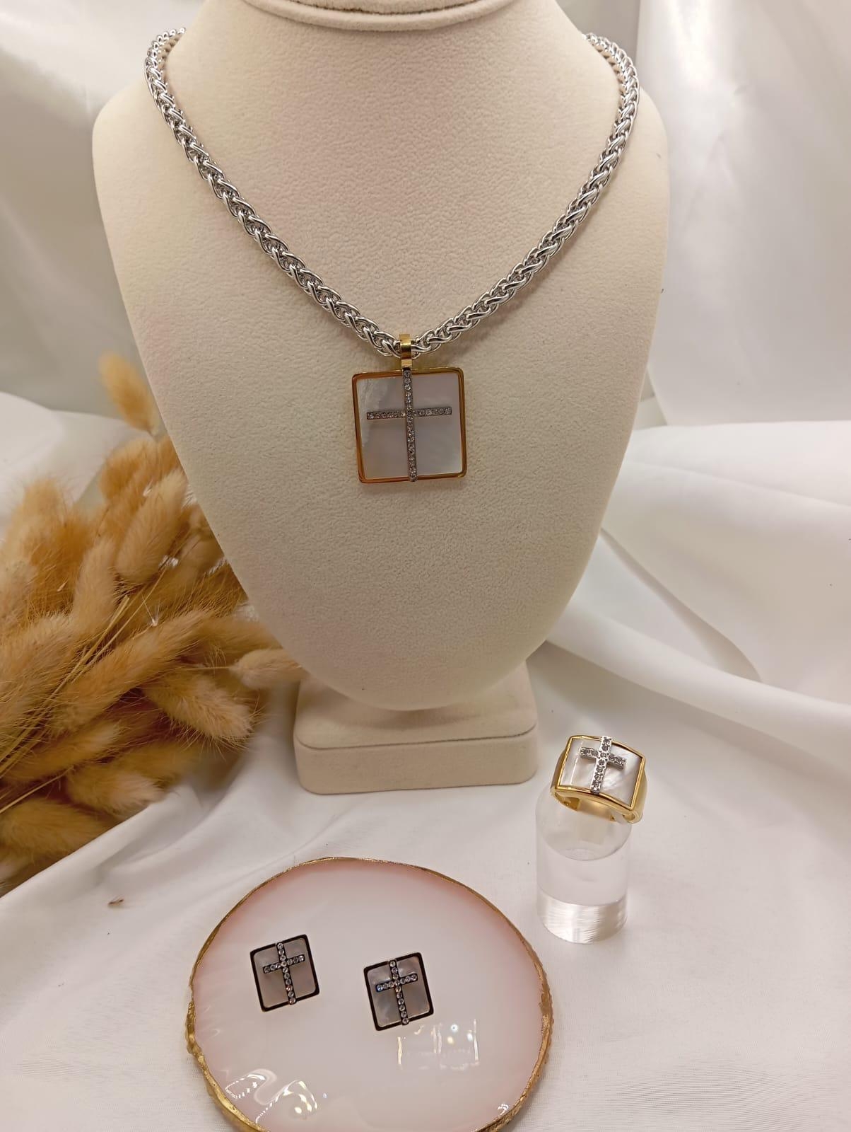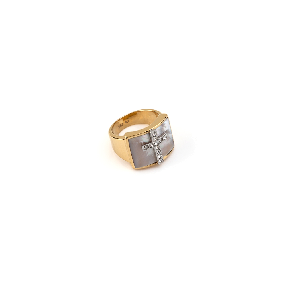 Anel em aço inoxidvel com quadrado em madreperola central com cruz em micozirconias cravejadas com mistura com banhode ouro