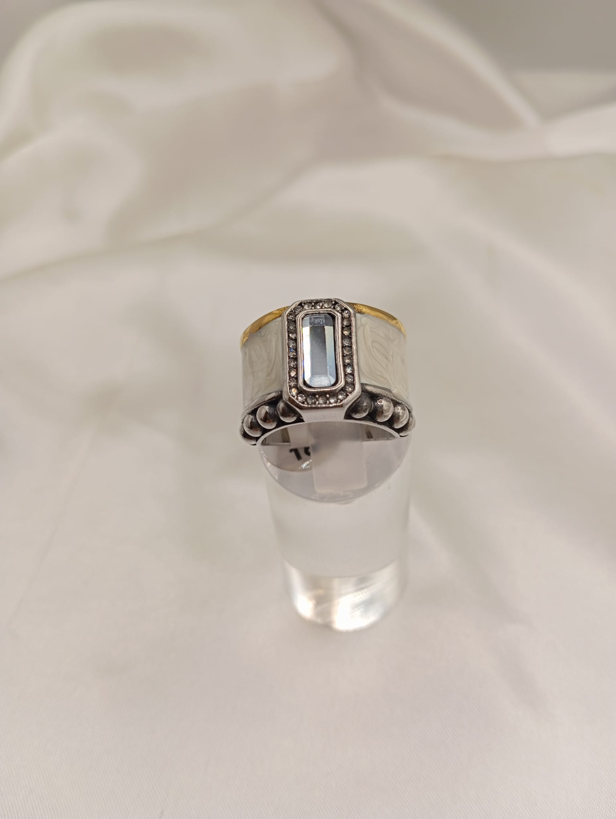 Anel em aço inoxidavel lacado com promenores de banho dourado e prateado, uma zirconia central delineada com microzirconias cristal