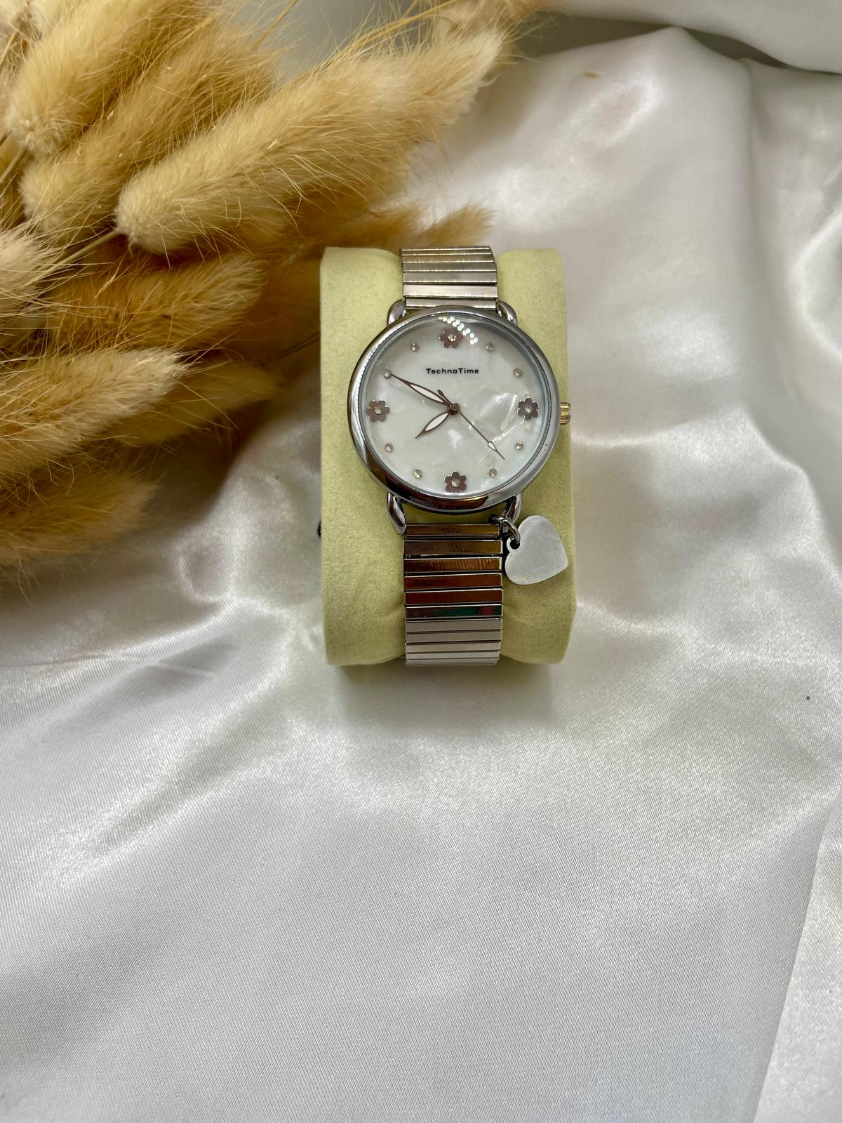 Relógio de senhora em aço inoxidavel com banho de prateado , visor de 3,6 cm com fundo em madre pérola . Bracelete com pendente em forma de coração com elastico , ideal para pulsos mais de maior diametro. Torna um look casual e elegante.