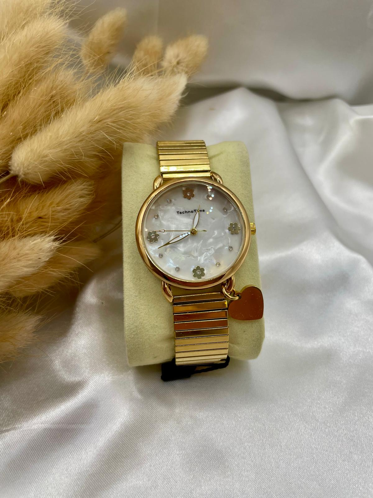 Relógio de senhora em aço inoxidavel com banho de ouro , visor de 3,6 cm com fundo em madre pérola . Bracelete com pendente em forma de coração com elastico , ideal para pulsos mais de maior diametro. Torna um look casual e elegante.