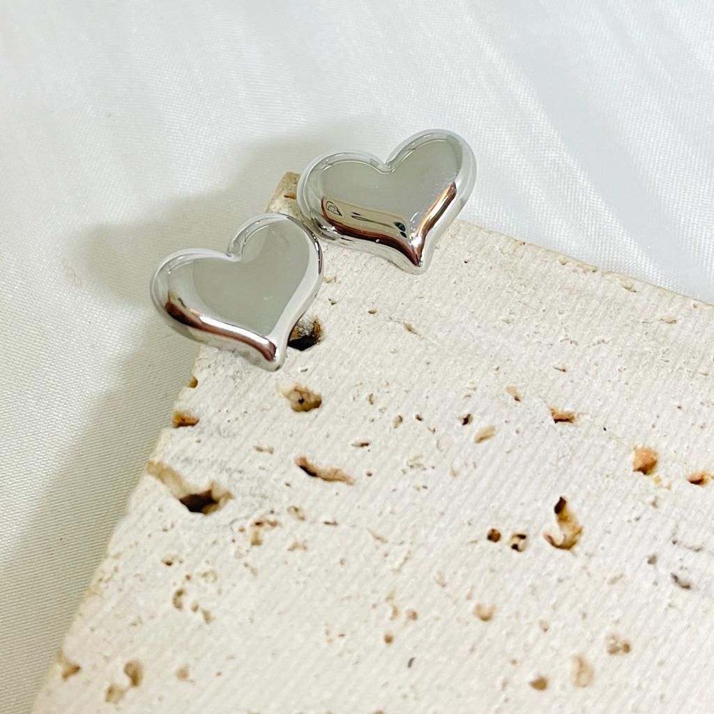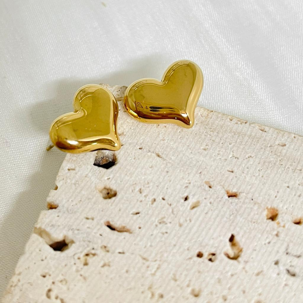 Brincos Coração em aço inoxidavel de espigão, disponivel em dourado e prateado, com 10 mm alt x 12 mm largura.