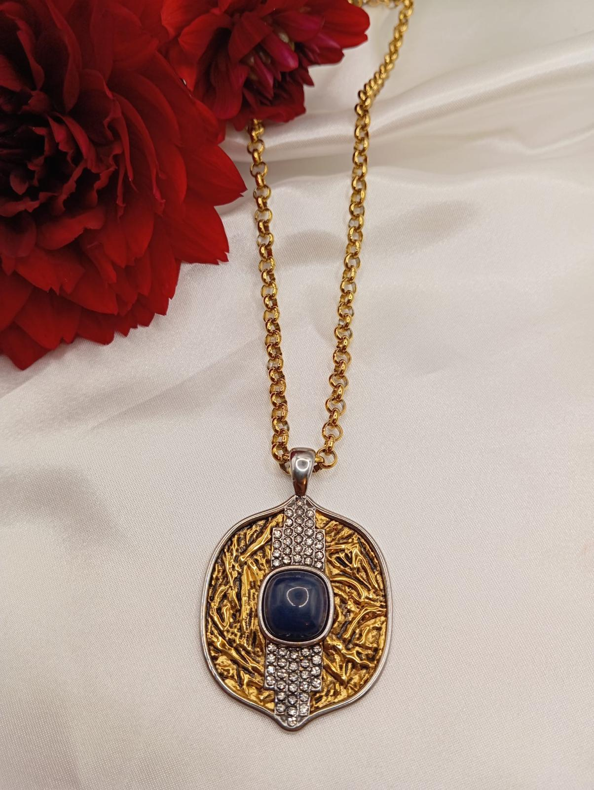 Colar Supremo com pedra natural azul marinho em aço inoxidavel colar banhado a ouro e pendente em duas cores de banho.