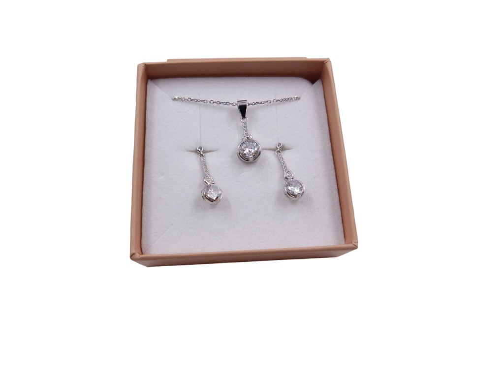 Conjunto de prata colar e brincos com zircónias. Colar mede 44 cm e brincos medem 1.8 cm. Peso total 3 g.
