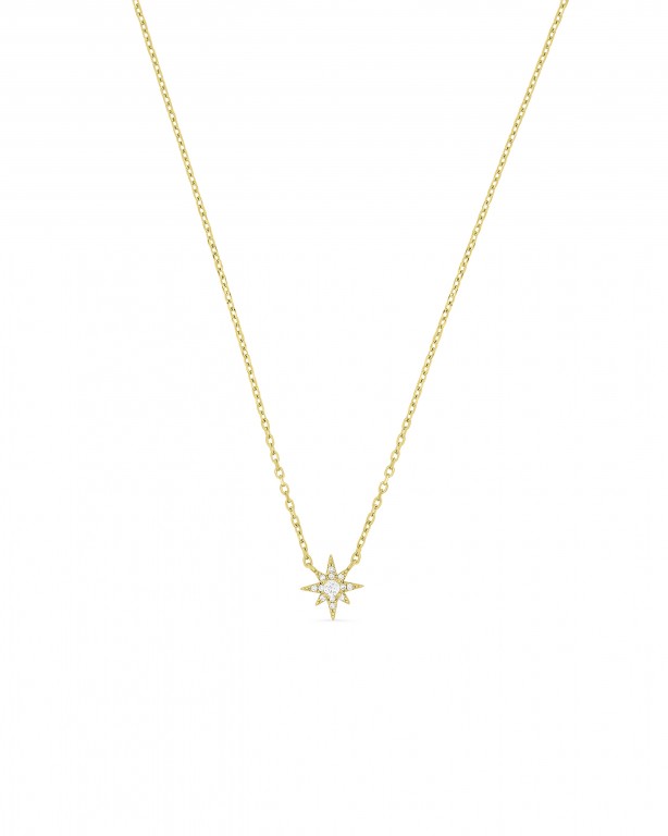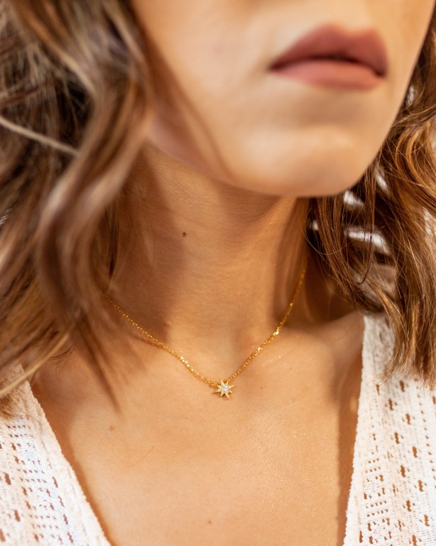 Colar de prata dourada com zircónias. Mede 40 cm + 5 cm de extensão. Peso 2.2 g.
