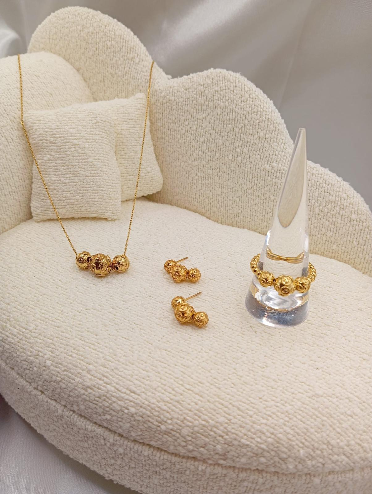 Brincos 3 contas de viana em aço inoxidavel com banho de ouro, com1.8 cm.