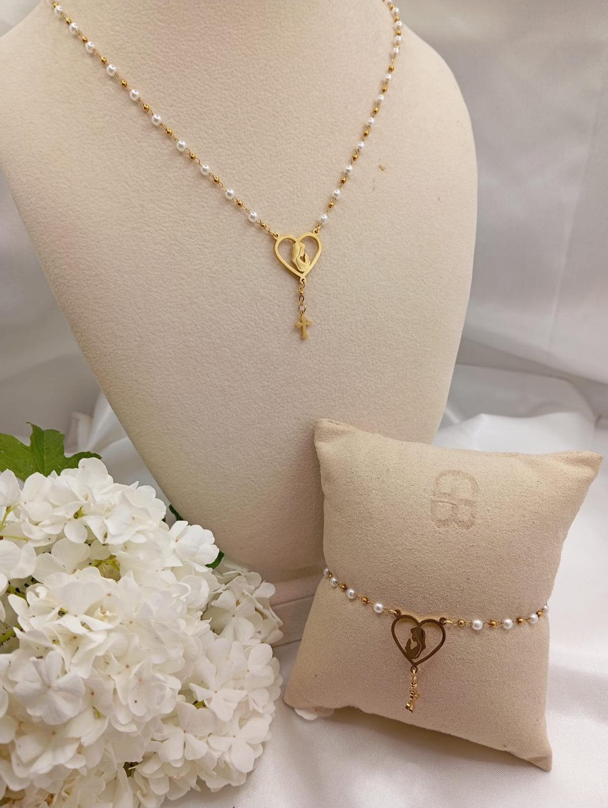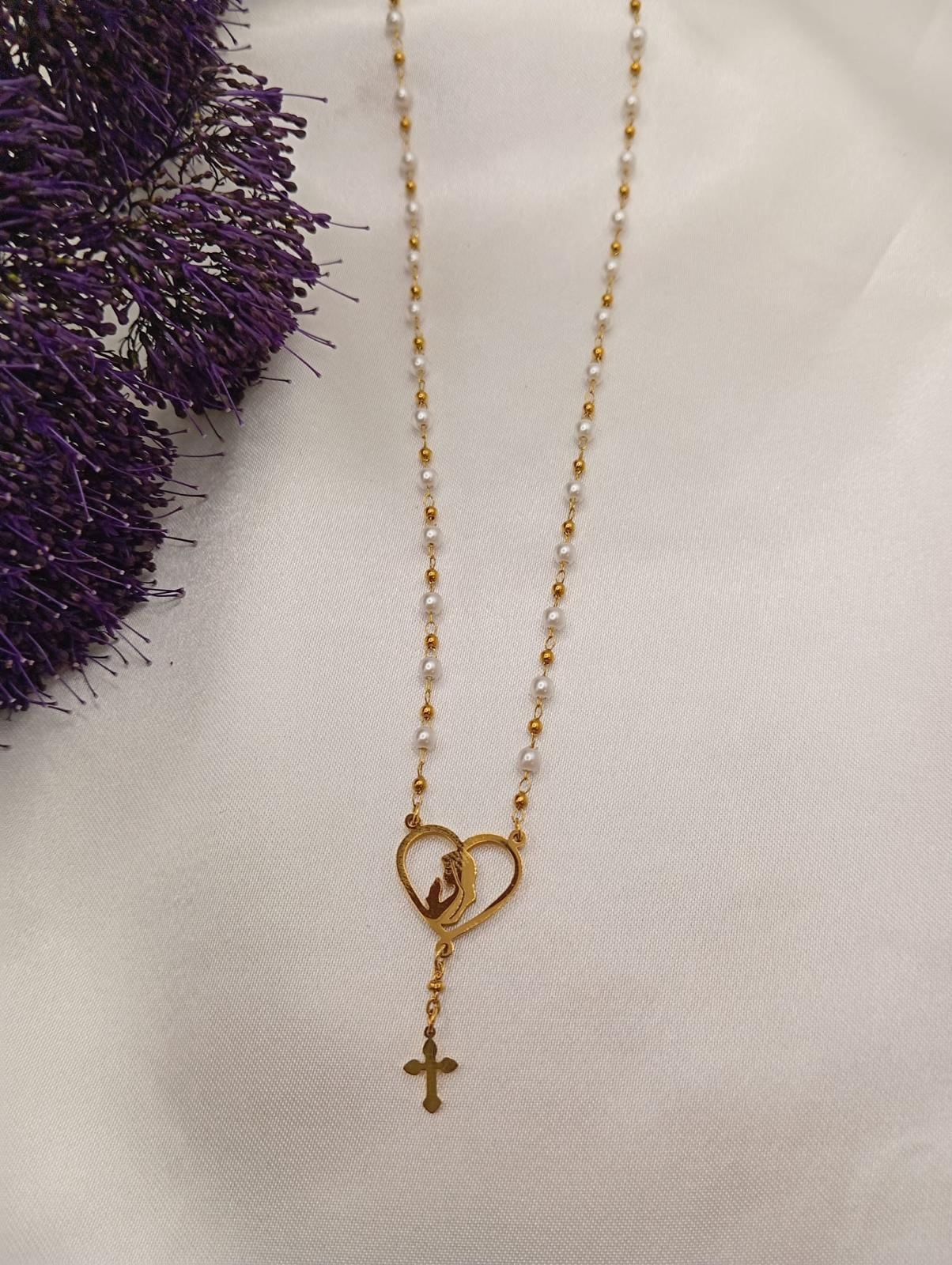 Colar Terço em aço inoxidavel e pérolas dourado de 40cm + 5 cm de extensor. pendente no centro com 1.5cm x 1.5 cm e cruz na ponta