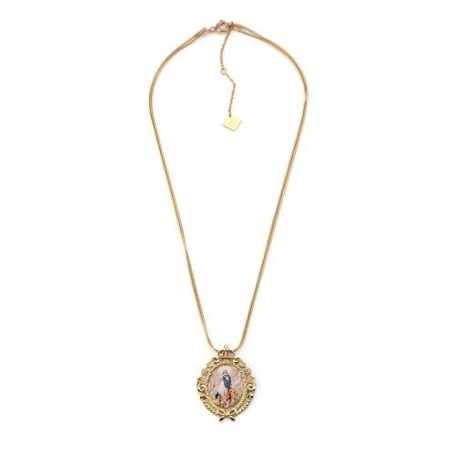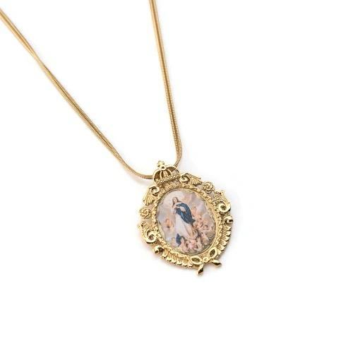 - Pingente Detalhado: Um pingente oval de 4cm alt x 3 cm larg com a imagem de N. Sra. da Conceição, emoldurado por um intrincado trabalho de metal que evoca uma coroa régia.